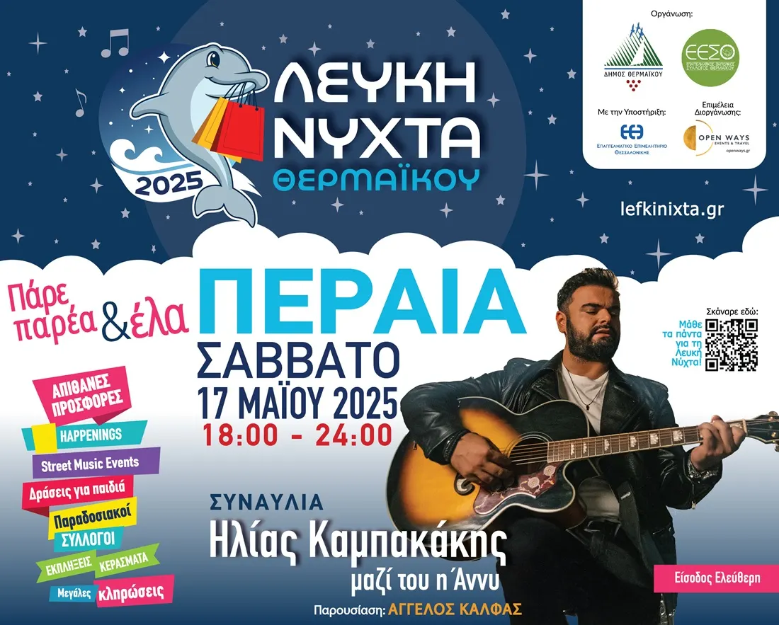 Ο Επαγγελματικός Εμπορικός Σύλλογος Θερμαϊκού και ο δήμος Θερμαϊκού ενώνουν τις δυνάμεις τους και προσκαλούν τους πολίτες στη 4η Λευκή Νύχτα στην Περαία. Η μεγάλη γιορτή που συνδυάζει το επιχειρείν με τον πολιτισμό και την ψυχαγωγία θα πραγματοποιηθεί το Σάββατο 17 Μαΐου από τις 18:00 ως τις 24:00 τα μεσάνυχτα.