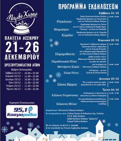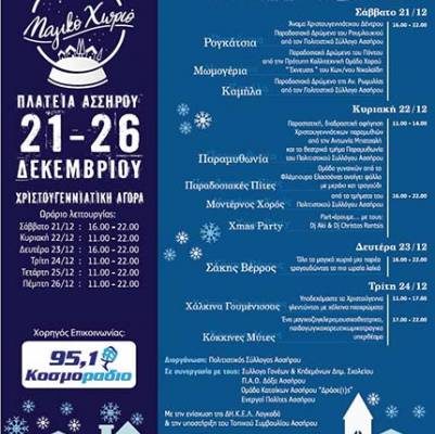Τις πύλες της θα ανοίξει το Σάββατο 21 Δεκεμβρίου το Μαγικό Χωριό στην Ασσηρο, μια χριστουγεννιάτικη αγορά που θα περιλαμβάνει μουσική, τέχνες, χορό, παιχνίδια, γεύσεις και παραδοσιακά έθιμα. Θεματικά σπιτάκια, ζογκλέρ, παιδικές δράσεις και παραστάσεις, αλλά και συναυλίες με αγαπημένα ονόματα καλλιτεχνών περιμένουν τους επισκέπτες να γιορτάσουν στο Μαγικό Χωριό.