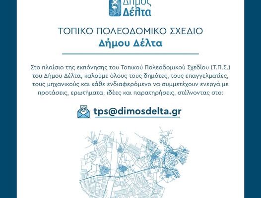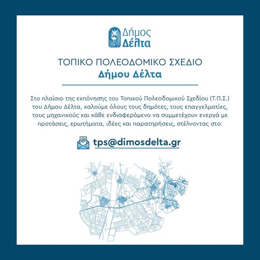 Στο πλαίσιο της διαβούλευσης και της εκπόνησης του Τοπικού Πολεοδομικού Σχεδίου (Τ.Π.Σ.) του Δήμου Δέλτα, καλούμε όλους τους δημότες, επαγγελματίες, μηχανικούς και φορείς να συμμετέχουν ενεργά, καταθέτοντας προτάσεις, ερωτήματα και ιδέες.