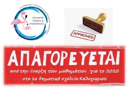 Μετά από πολύωρη συνέλευση του Δ.Σ. του συλλόγου μας, αποφασίστηκε ομόφωνα ότι με την έναρξη των μαθημάτων του σχολείου μας για το 2020 θα ΑΠΑΓΟΡΕΥΕΤΑΙ ………………….. σε όλους τους χώρους του 1ο Δημοτικού σχολείου Καλοχωρίου!