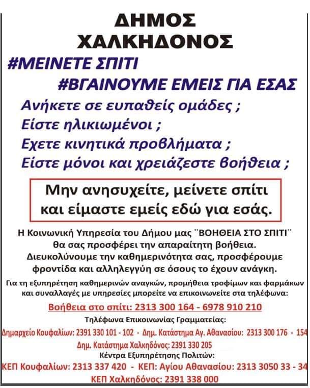 Ανακοίνωση του δήμου Χαλκηδόνος για τούς δημότες που τούς παροτρύνει να μείνουν στο σπίτι  !