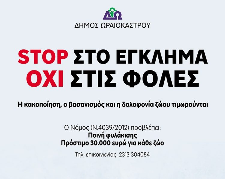 Μήνυση κατά αγνώστων για υποθέσεις κακοποίησης ζώων κατατέθηκε από πλευράς δήμου Ωραιοκάστρου, έπειτα από σχετική εντολή που δόθηκε από τον δήμαρχο Παντελή Τσακίρη, με αφορμή καταγγελίες για περιπτώσεις βασανιστικής θανάτωσης κουταβιών, σκύλων και μίας γάτας στις περιοχές του Πενταλόφου και του Μελισσοχωρίου, τις οποίες δέχθηκαν στελέχη της δημοτικής αρχής μέσα στο περασμένο Σαββατοκύριακο.