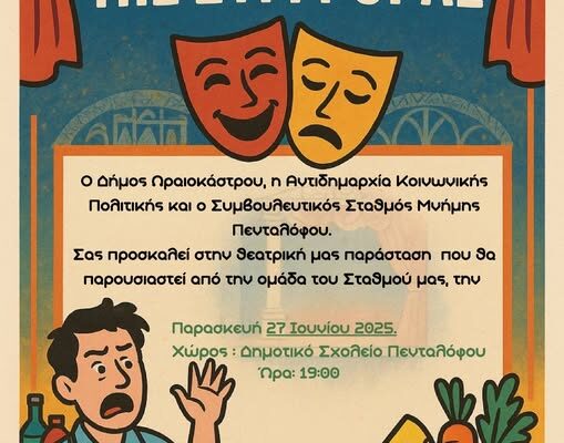 Ο Δήμος Ωραιοκάστρου, η αντιδημαρχία Κοινωνικής Πολιτικής και Αλληλεγγύης και ο Συμβουλευτικός Σταθμός Μνήμης Πενταλόφου προσκαλούν τους πολίτες στη θεατρική παράσταση «Το μπακάλικο της συμφοράς» με πρωταγωνιστές τα μέλη της ομάδας νοητικής ενίσχυσης του Συμβουλευτικού Σταθμού Μνήμης.