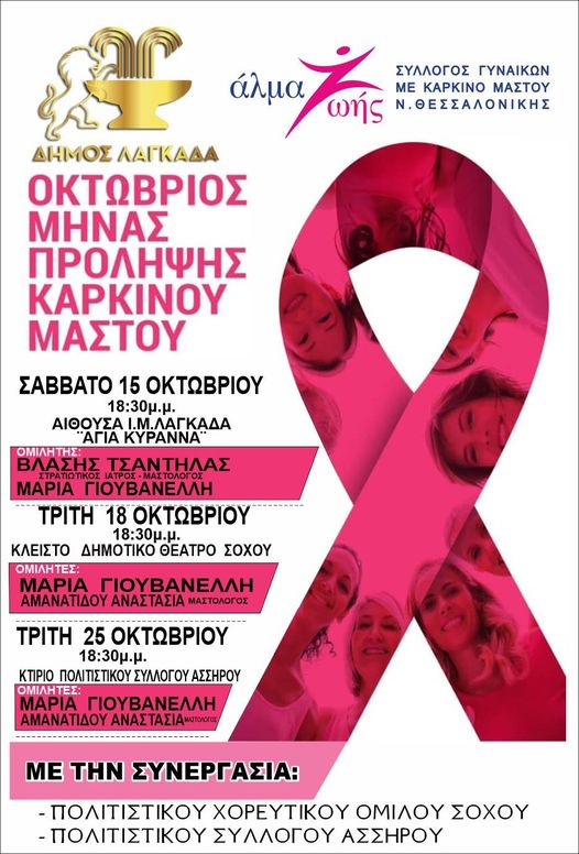 🔻Σε συνεργασία με τον Σύλλογο Γυναικών με Καρκίνο Μαστού Ν. Θεσσαλονίκης «Άλμα Ζωής» Άλμα Ζωής Ν.Θεσσαλονίκης, πρόκειται να πραγματοποιηθούν τρεις συνολικά ενημερωτικές εκδηλώσεις.