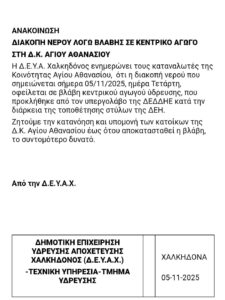 ΔΕΥΑ ΧΑΛΚΗΔΟΝΟΣ : Διακοπή νερού στον ΑΓ.ΑΘΑΝΑΣΙΟ