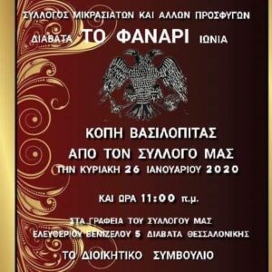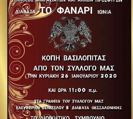 Δήμος-Δέλτα / ΠολιτιστικάΔιαβατά : Σύλλογος Μικρασιατών και Προσφύγων – Κοπή Βασιλόπιτας 24 Ιανουαρίου 2020 Καλούνται όλα τα μέλη των τμημάτων… Διαβατά : Σύλλογος Μικρασιατών και Προσφύγων – Κοπή Βασιλόπιτας Κοινοποιήστε: Πατήστε για κοινοποίηση στο Facebook(Ανοίγει σε νέο παράθυρο) Facebook Click to share on X(Ανοίγει σε νέο παράθυρο) X Σχετικά