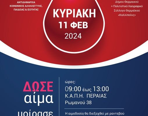 Εθελοντική Αιμοδοσία θα πραγματοποιηθεί την Κυριακή 11 Φεβρουαρίου 2024 και ώρες 09:00 έως 13:00 στο ΚΑΠΗ Περαίας (Ρωμανού 38).