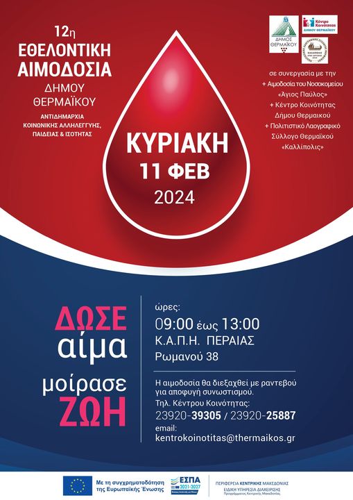 Δ. ΘΕΡΜΑΙΚΟΥ : Εθελοντική Αιμοδοσία θα πραγματοποιηθεί την Κυριακή 11 Φεβρουαρίου