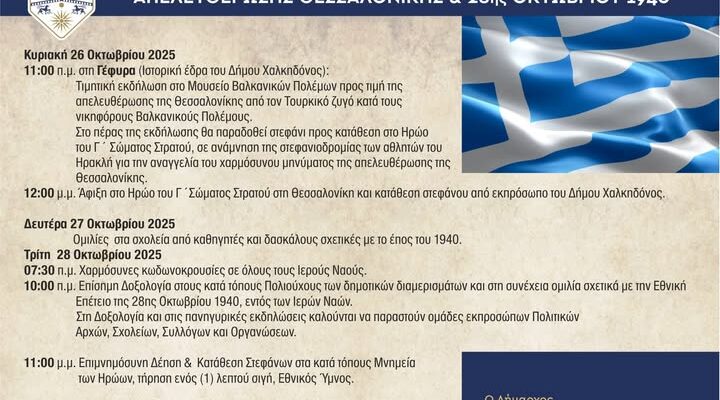 – Γενικός Σημαιοστολισμός σε όλη την επικράτεια από την ογδόη πρωινή ώρα (08.00′) της 25ης Οκτωβρίου μέχρι τη δύση του ηλίου της 28ης Οκτωβρίου 2025.