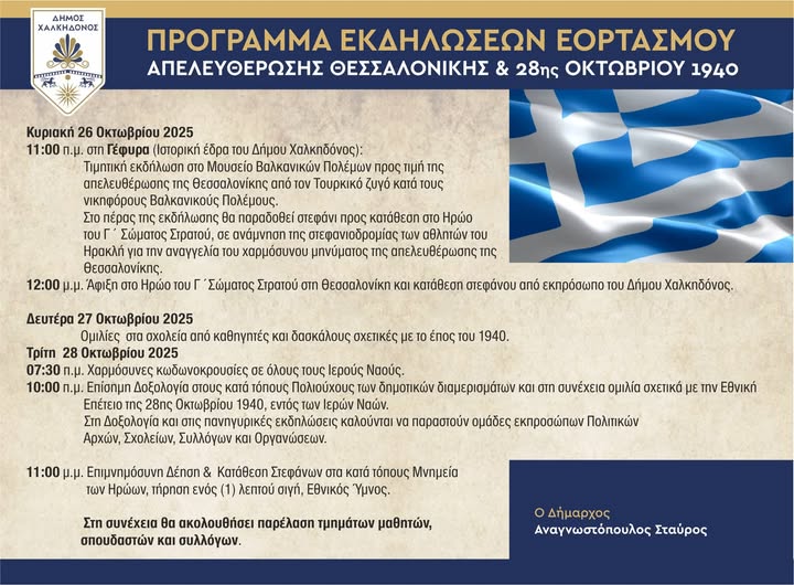 Με κάθε επισημότητα θα πραγματοποιηθούν στον Δήμο Χαλκηδόνος οι εορταστικές εκδηλώσεις της 28ης Οκτωβρίου 1940, ημέρα υπενθύμισης της αντίστασης της πατρίδας μας ενάντια στο φασισμό και το ναζισμό και των αγώνων των λαών για τη δημοκρατία και την ανθρώπινη αξιοπρέπεια, για την επέτειο του “ΌΧΙ”.