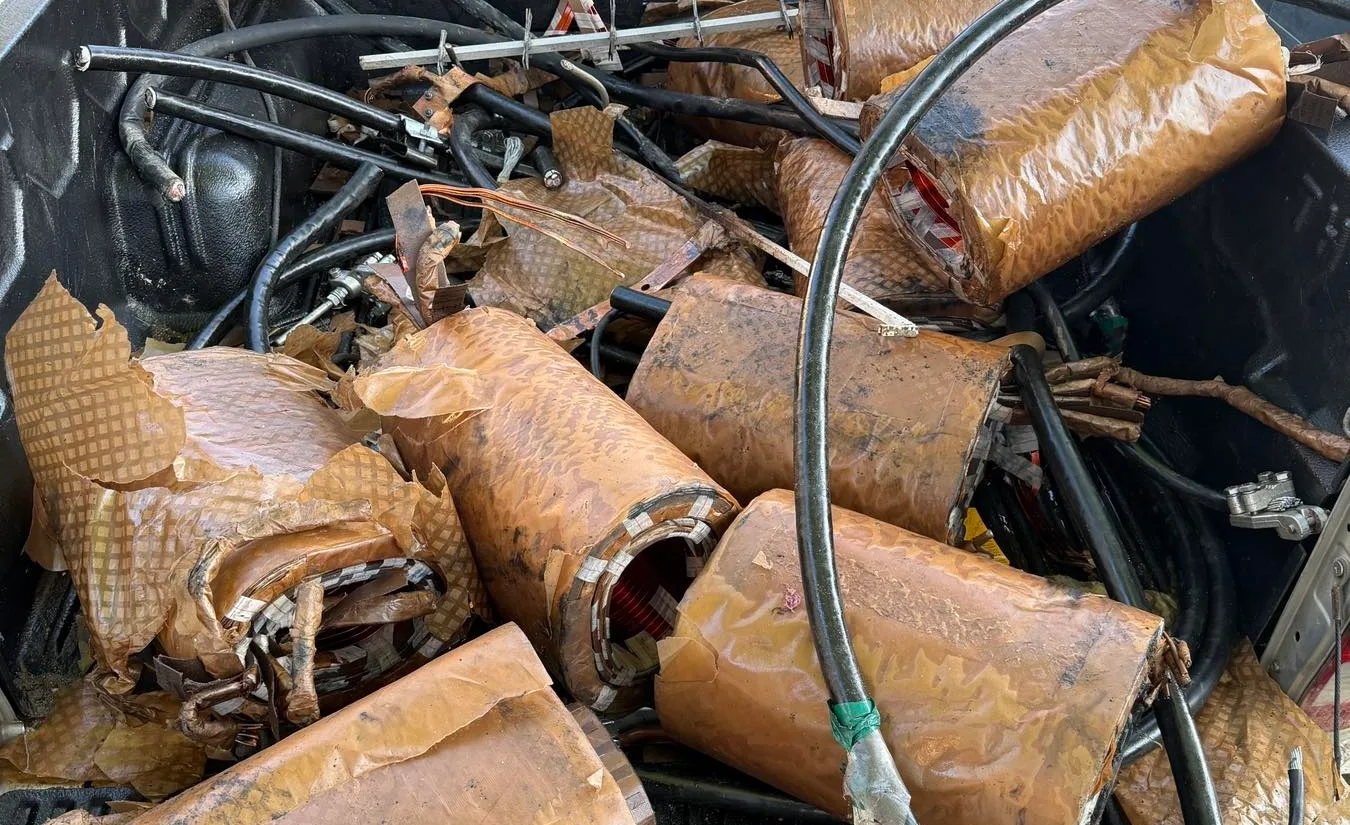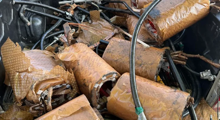 Στην καρότσα του οχήματος, για το οποίο είχε δηλωθεί κλοπή τις προηγούμενες ημέρες στο ΑΤ Βόλβης, βρέθηκαν και κατασχέθηκαν εννιά πηνία χαλκού, που αφαιρέθηκαν από τρεις ισάριθμους μετασχηματιστές καθώς και πλήθος εργαλείων, που χρησιμοποιούνται για την αφαίρεση μετασχηματιστών.