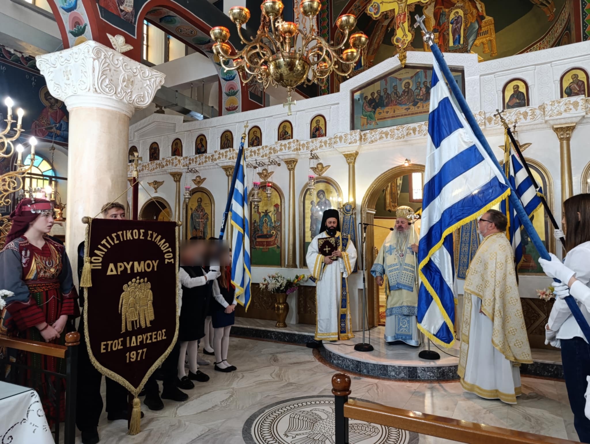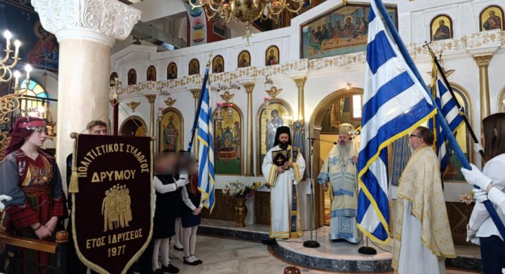 Στον Ιερό Ναό Κοιμήσεως Θεοτόκου στο Δρυμό οι εκδηλώσεις έγιναν χοροστατούντος του Σεβασμιότατου Μητροπολίτη Λητής, Λαγκαδά και Ρεντίνης, κ. Πλάτωνα. Τελέστηκε Δοξολογία και στη συνέχεια μνημόσυνο για τους πεσόντες του Μακεδονικού Αγώνα. Η υποδιευθύντρια του Γυμνασίου Μυγδονίας, κ. Νίκη Μακρή εκφώνησε τον Πανηγυρικό της Ημέρας εντός της εκκλησίας.