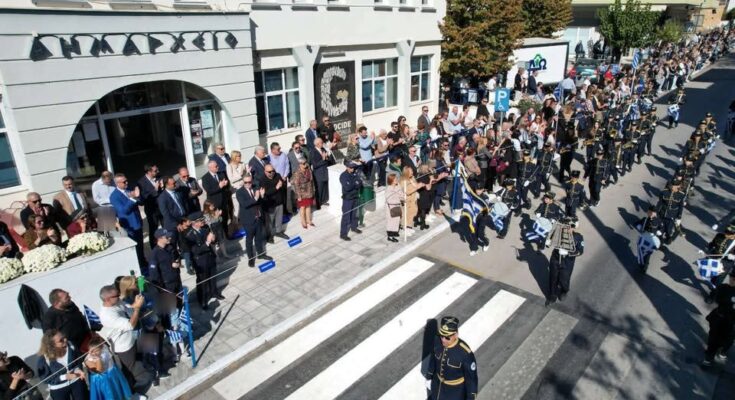 Ώρα 11:00 π.μ.: Παράταξη των τμημάτων παρέλασης των σχολικών μονάδων και φορέων της πόλης στην οδό Κομνηνών (κεντρική οδός Δημαρχείου) για την παρέλαση.