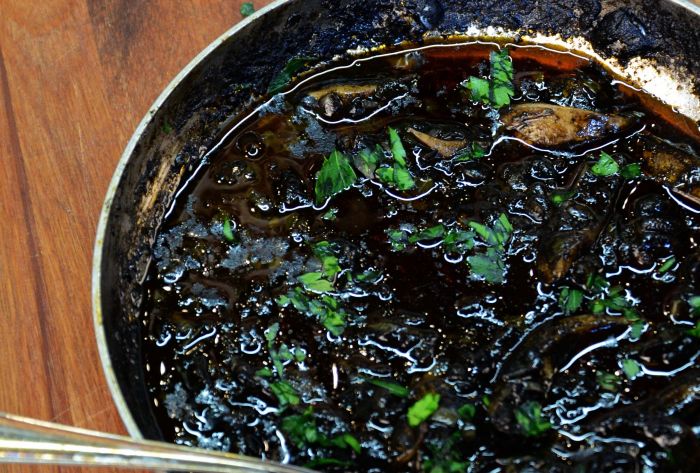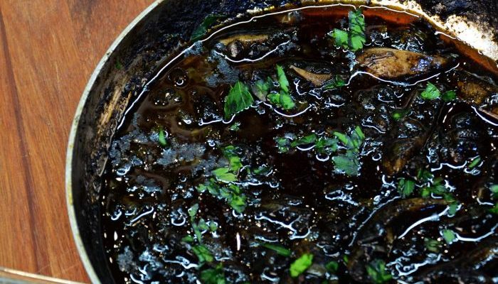 «Είναι μια συνταγή με σουπιά και το μελάνι της. Οι σουπιές τηγανίζονται μαζί με το μελάνι και μάλιστα σε ορισμένες περιοχές, σβήνουν στο τηγάνι με ξύδι. Πρόκειται για μια συνταγή ιδιαίτερη και πολύ νόστιμη με καταγωγή από την αρχαία Ελλάδα. Αντίστοιχη καταγωγή έχουν και τα σαλιγκάρια, οι γνωστοί χοχλιοί, μαγειρεμένοι με πλιγούρι», αναφέρει.