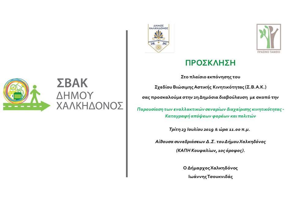 Στο πλαίσιο εκπόνησης του Σχεδίου Βιώσιμης Αστικής Κινητικότητας (ΣΒΑΚ) σας προσκαλούμε στη 2η Δημόσια διαβούλευση με σκοπό την ‘Παρουσίαση των εναλλακτικών σεναρίων διαχείρισης κινητικότητας – Καταγραφή απόψεων φορέων και πολιτών’, την Τρίτη, 23 Ιουλίου 2019 και ώρα 11.00, στην αίθουσα συνεδριάσεων του Δημοτικού Συμβουλίου Χαλκηδόνος (ΚΑΠΗ Κουφαλίων, 1ος όροφος)