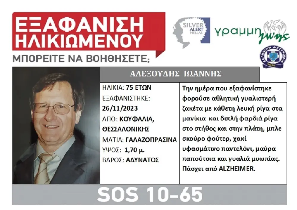 Συγκεκριμένα, πρόκειται για τον Ιωάννη Αλεξούδη, 75 ετών, ο οποίος εξαφανίστηκε από το σπίτι του στα Κουφάλια Θεσσαλονίκης το μεσημέρι της 26/11/2023, όταν βγήκε για την καθημερινή του βόλτα και δεν κατάφερε να επιστρέψει.