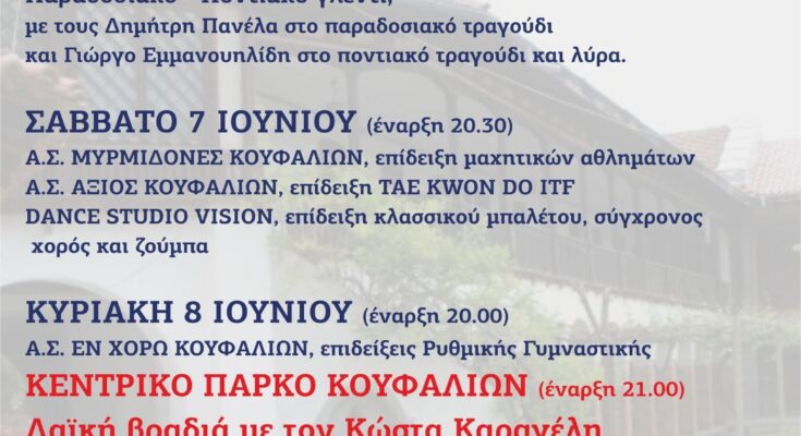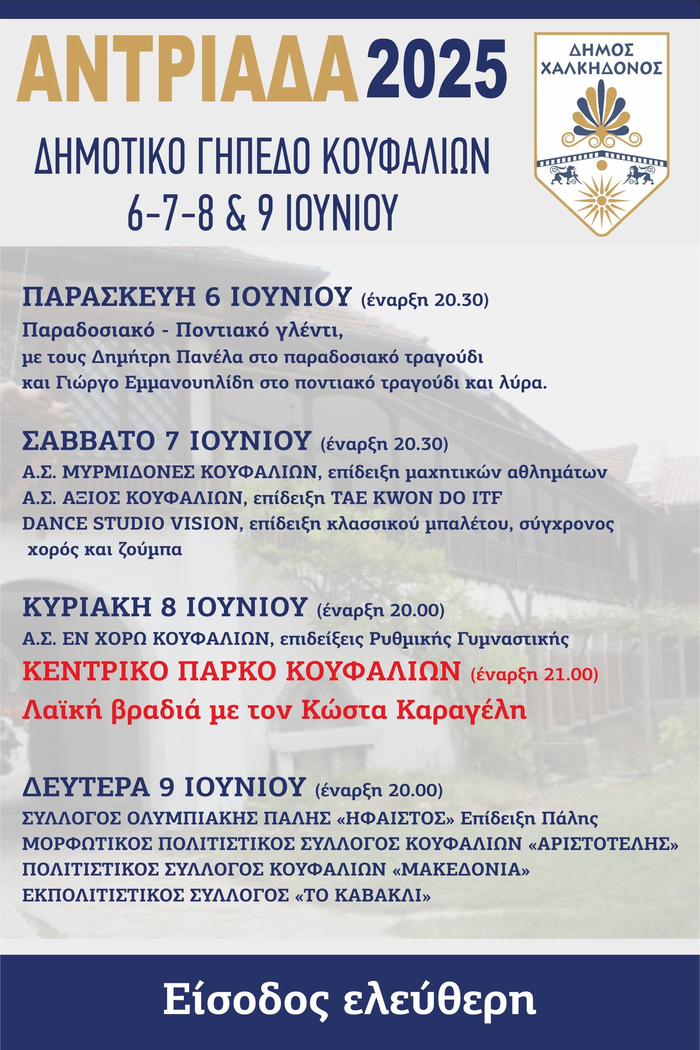 Ποικίλες εκδηλώσεις περιλαμβάνει το φετινό πρόγραμμα της “Αντριάδα 2025” που διοργανώνει ο Δήμος Χαλκηδόνος σε συνεργασία με πολιτιστικούς και αθλητικούς συλλόγους και σχολές χορού της περιοχής το τετραήμερο 6-9 Ιουνίου στο Δημοτικό Γήπεδο Κουφαλίων και την Κεντρική Πλατεία Κουφαλίων.