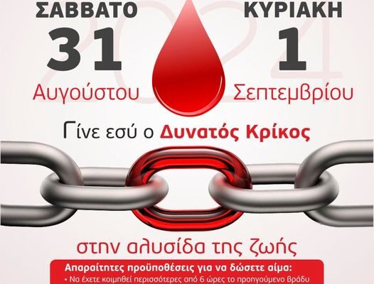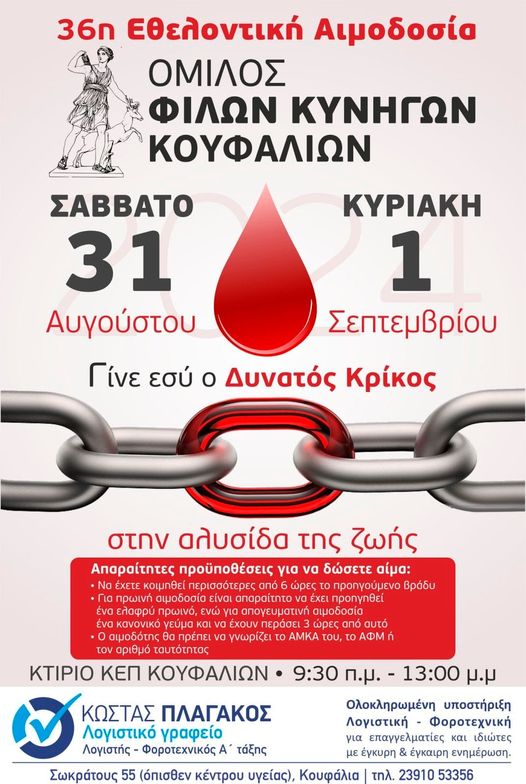 Δήμος Χαλκηδόνος / Επικαιρότητα / ΚουφάλιαΚΟΥΦΑΛΙΑ : Όμιλος Κυνηγών Κουφαλίων / 36η εθελοντική αιμοδοσία 27 Αυγούστου 2024 Όμιλος Κυνηγών Κουφαλίων 36η εθελοντική αιμοδοσία Γίνε εσύ ο δυνατός κρίκος στην αλυσίδα της ζωής. Σάββατο 31/08/2024 Κυριακή 01/09/2024 09.30π.μ.-13.00μ.μ. Κοινοποιήστε: Πατήστε για κοινοποίηση στο Facebook(Ανοίγει σε νέο παράθυρο) Facebook Click to share on X(Ανοίγει σε νέο παράθυρο) X Σχετικά