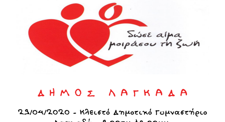 Η αιμοδοσία θα πραγματοποιηθεί την Τετάρτη 29 Απριλίου 2020 στο ΚΛΕΙΣΤΟ ΔΗΜΟΤΙΚΟ ΓΥΜΝΑΣΤΗΡΙΟ ΛΑΓΚΑΔΑ (γήπεδο Ερμή, παραπλεύρως Μπίλλειου Πολιτιστικού Κέντρου) από ώρες 9 το πρωί έως τη 1 το μεσημέρι.
