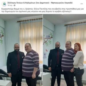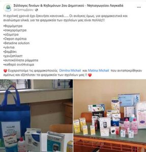 Όπως ανέφερε στο lagadas.net του μέλος του Δ.Σ. του Συλλόγου Ανδριάννα Καραγιάννη, «φαρμακεία της περιοχής Λαγκαδά (Δήμητρα Μιχαήλ, Ματίνα Μιχαήλ, Κουρούπη Χαρούλα) έκαναν χορηγία τα φάρμακα και τα σχετικά αναλώσιμα που χρειάζονται για το ιατρείο. Ο Σύλλογος Γονέων αγόρασε τα έπιπλα, ενώ το γραφείο τελετών του κου Χρήστου Παντέλη μας έκανε δωρεά το ειδικό κρεβάτι εξέτασης».