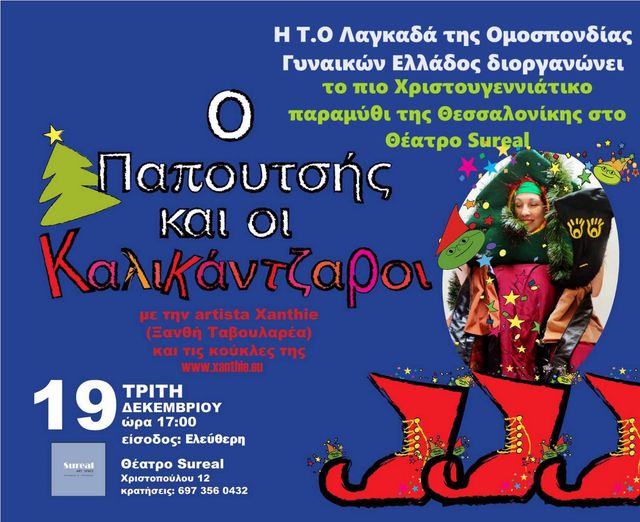 Η Τ.Ο. Λαγκαδά της Ομοσπονδίας Γυναικών Ελλάδος σε συνεργασία με το Θέατρο Sureal σας προσκαλούν την Τρίτη 19 Δεκεμβρίου και ώρα 17:00, στο πιο Χριστουγεννιάτικο Παραμύθι της Θεσσαλονίκης.