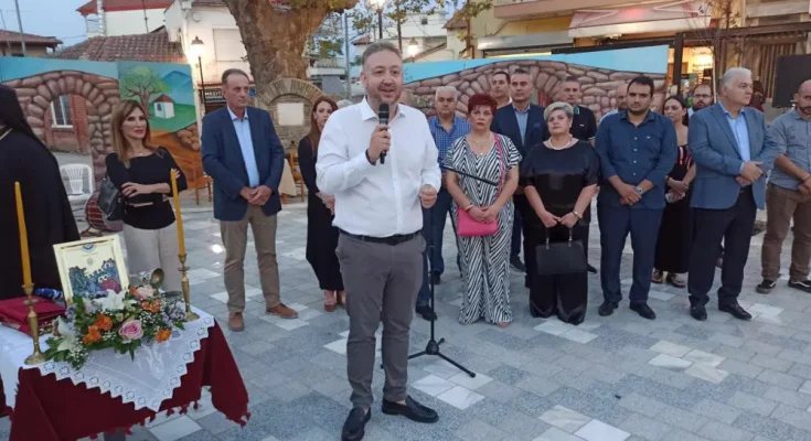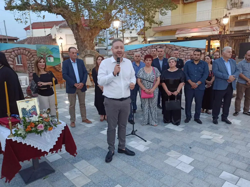 Και πρόσθεσε: «Όταν ο δήμαρχος, Παντελής Τσακίρης, μας είπε το 2020 ότι θέλει να προχωρήσει στην ανάπλαση της πλατείας, όλοι κοιταχτήκαμε. Κι αυτό γιατί είχαμε στο μυαλό μας άλλα βασικά θέματα, όπως την αποχέτευση, την βελτίωση των αστικών συγκοινωνιών, την συντήρηση δρόμων, το φυσικό αέριο, την λειτουργία ΚΕΠ. Ο δήμαρχος μας είπε ΄΄θα γίνουν΄΄! Και με χαρά είδαμε ότι πράγματι όλα μπήκαν σε τροχιά υλοποίησης. Ήρθε ο δήμαρχος μαζί με τους αρχιτέκτονες και ζήτησαν από το Συμβούλιο να δώσουμε το στίγμα μας. Οι σύμβουλοι και εγώ καθίσαμε και εστιάσαμε σε τρία σημεία: Το ένα ήταν να αποτελεί η πλατεία σημείο αναφοράς για όλο το χωριό, πόλο έλξης για όλη την περιοχή, πράγμα που νομίζω το πετύχαμε. Δεύτερο και σημαντικό να συνδέσουμε την πλατεία με το κύριο θρησκευτικό μας κέντρο και μνημείο, τον ιερό ναό του Αγίου Γεωργίου, για αυτό έγινε η όδευση του λιθόστρωτου ως την εκκλησία. Και τρίτο να αποφύγουμε το ΄΄ράβε ξήλωνε΄΄, να περάσουν δηλαδή όλες οι υποδομές, και έτσι έγινε, υλοποιήθηκαν όλες οι υποδομές και σήμερα χαιρόμαστε την πλατεία».