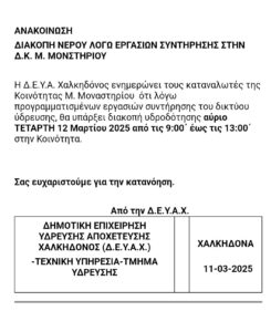 ΔΕΥΑ - ΔΗΜΩΝ / Δήμος Χαλκηδόνος / ΕπικαιρότηταΜ. ΜΟΝΑΣΤΗΡΙ : Σήμερα διακοπή νερου 12 Μαρτίου 2025 Κοινοποιήστε: Πατήστε για κοινοποίηση στο Facebook(Ανοίγει σε νέο παράθυρο) Facebook Click to share on X(Ανοίγει σε νέο παράθυρο) X Σχετικά