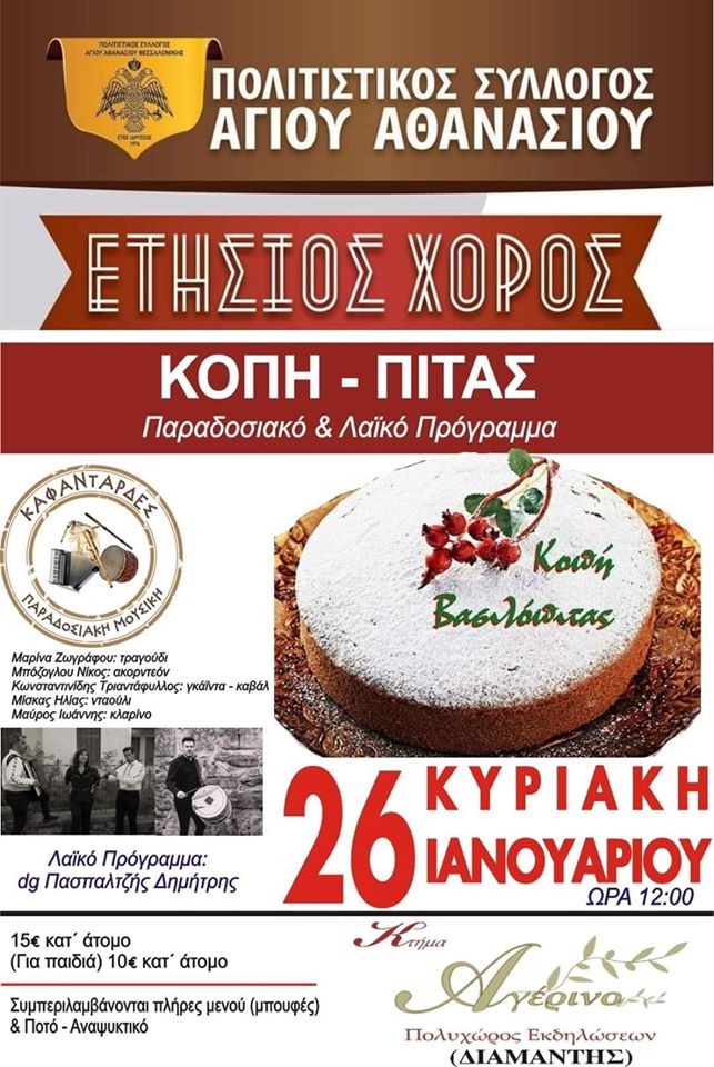 Άγιος Αθανάσιος / ΚΟΥΛΤΟΥΡΑ-ΑΦΙΣΣΕΣΠολιτιστικός Σύλλογος Αγίου Αθανασίο: Ετήσιος Χορός – Κοπή Πίτας ! 20 Ιανουαρίου 2020 Η παρουσία όλων σάς θα μας τιμήσει ιδιαίτερα!! Τηλ κρατήσεων: 6986615481 & 693 651 6260 Κοινοποιήστε: Πατήστε για κοινοποίηση στο Facebook(Ανοίγει σε νέο παράθυρο) Facebook Click to share on X(Ανοίγει σε νέο παράθυρο) X Σχετικά