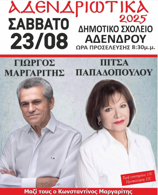 Δήμος Χαλκηδόνος / Επικαιρότητα / ΠολιτιστικάΠολιτιστικός Σύλλογος Αδένδρου «η Πρόοδος» : ΑΔΕΝΔΡΙΩΤΙΚΑ 2025 – Σάββατο 23 Αυγούστου 4 Αυγούστου 2025 ΑΔΕΝΔΡΙΩΤΙΚΑ 2025 Σάββατο 23 Αυγούστου Συναυλία με τον ΓΙΩΡΓΟ ΜΑΡΓΑΡΙΤΗ και την ΠΙΤΣΑ ΠΑΠΑΔΟΠΟΥΛΟΥ. Είσοδος 15€ Προπώληση 12€ Ηλεκτρονική προπώληση μέσω www.ticketservices.gr στον παρακάτω σύνδεσμο: https://www.ticketservices.gr/…/adendriotika-2025…/ ΣΗΜΕΙΑ ΠΡΟΠΩΛΗΣΗΣ 1. ΑΔΕΝΔΡΟ Alegria – Γυναικεία και παιδική ένδυση Νύχτας-Αρτοζαχαροπλαστείο 2. ΑΛΕΞΑΝΔΡΕΙΑ Boston Breakfast Coffee & More Υποδήματα Κόκκου Δήμητρα 3. ΚΟΥΦΑΛΙΑ Ανθοπωλείο “Blossom” – Λένα Κωστούδη 4. ΚΥΜΙΝΑ The Drippers Coffee 5. ΧΑΛΑΣΤΡΑ 4all Store 6. ΧΑΛΚΗΔΟΝΑ Boston Breakfast Coffee & More Περίπτερο πλατείας Χαλκηδόνας – Τάκας Ώρα προσέλευσης 8.30 μ.μ. Θα λειτουργεί καντίνα στον χώρο. Δημοτικό Σχολείο Αδένδρου 2391031215 ps.hproodos@yahoo.gr Κοινοποιήστε: Πατήστε για κοινοποίηση στο Facebook(Ανοίγει σε νέο παράθυρο) Facebook Click to share on X(Ανοίγει σε νέο παράθυρο) X Σχετικά