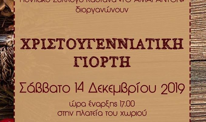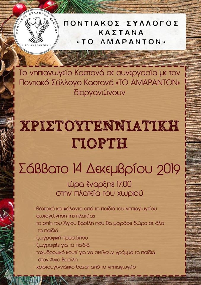 Το Νηπιαγωγείο του κάστανα σε συνεργασία με τον Ποντιακό Συλλόγο Καστανά ΤΟ ΑΜΑΡΑΝΤΟΝ διοργανώνουν χριστουγεννιάτικη γιορτή το Σάββατο 14 Δεκεμβρίου και ωρα έναρξης 17:00 στην πλατεία τού χωριού.Ελατε να περάσουμε υπέροχα..