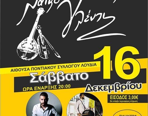 Με χαρά σας προσκαλούμε στο λαικοποντιακό γλέντι που διοργανώνει ο σύλλογος μας το Σάββατο 16 Δεκεμβρίου. Καλή διάθεση και όρεξη για χορό, τα μυστικά για μια ξεχωριστή βραδιά. Η παρουσία όλων σας θα μας τιμήσει ιδιαίτερα!!!