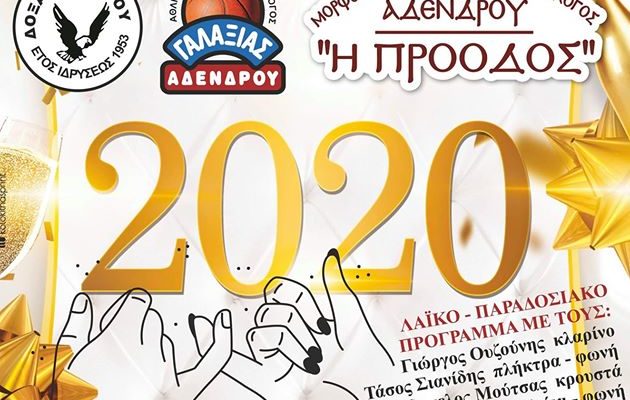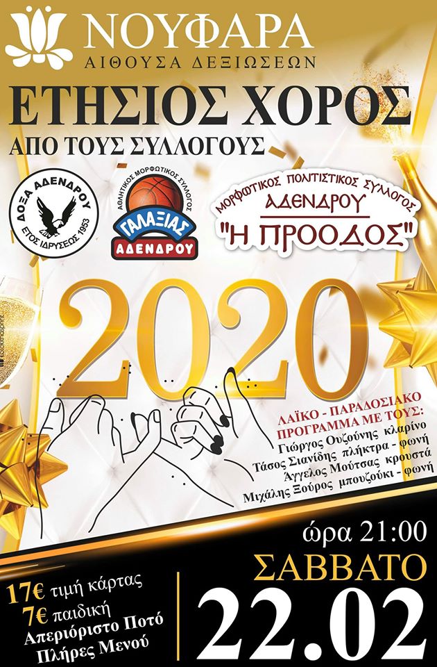 Οι τρεις σύλλογοι του Άδενδρου, Δόξα, Γαλαξίας και Πρόοδος, κάνουν ΜΑΖΙ τον ετήσιο χορό τους το Σάββατο 22 Φεβρουαρίου στην Αίθουσα Δεξιώσεων Νούφαρα, στον Βαθύλακκο.