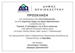 ΠΡΌΣΚΛΗΣΉ ΣΤΗΝ ΤΕΛΕΤΉ ΟΡΚΩΜΟΣΊΑΣ ΤΗΣ ΝΕΑΣ ΔΗΜΟΤΙΚΉΣ ΑΡΧΗΣ ΔΗΜΟΥ ΩΡΑΙΟΚΆΣΤΡΟΥ
