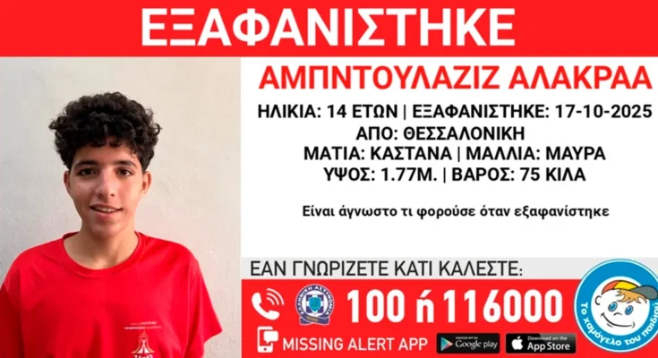 Συναγερμός έχει σημάνει μετά την εξαφάνιση 14χρονου αγοριού από το Ωραιόκαστρο. Τα ίχνη του Αμπντουλαζίζ Αλακραά, χάθηκαν χθες στις 10.30 το πρωί από τον χώρο φιλοξενίας στην περιοχή του Ωραιοκάστρου.