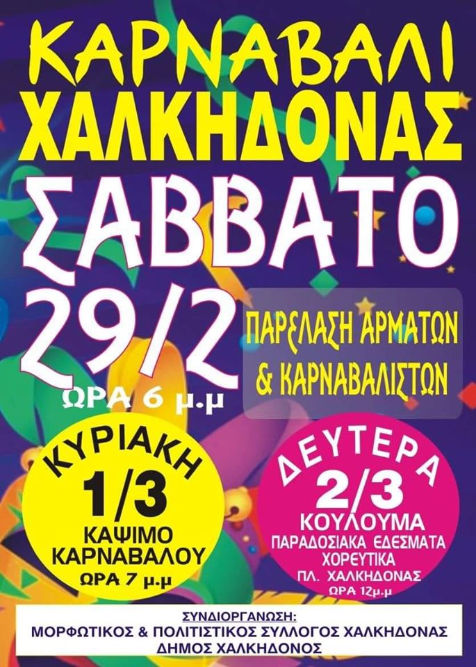 Εκδηλώσεις της Αποκριάς…με κέφι και διάθεση για διασκέδαση και ξεφάντωμα διοργανώνει ο Μορφωτικός & Πολιτιστικός Σύλλογος Χαλκηδόνας σε συνεργασία με το Δήμο Χαλκηδόνας!